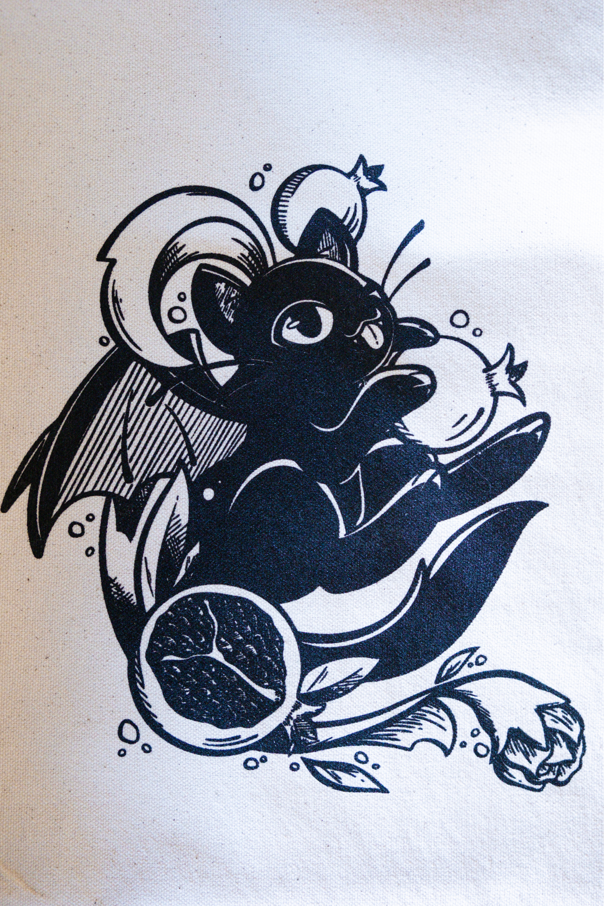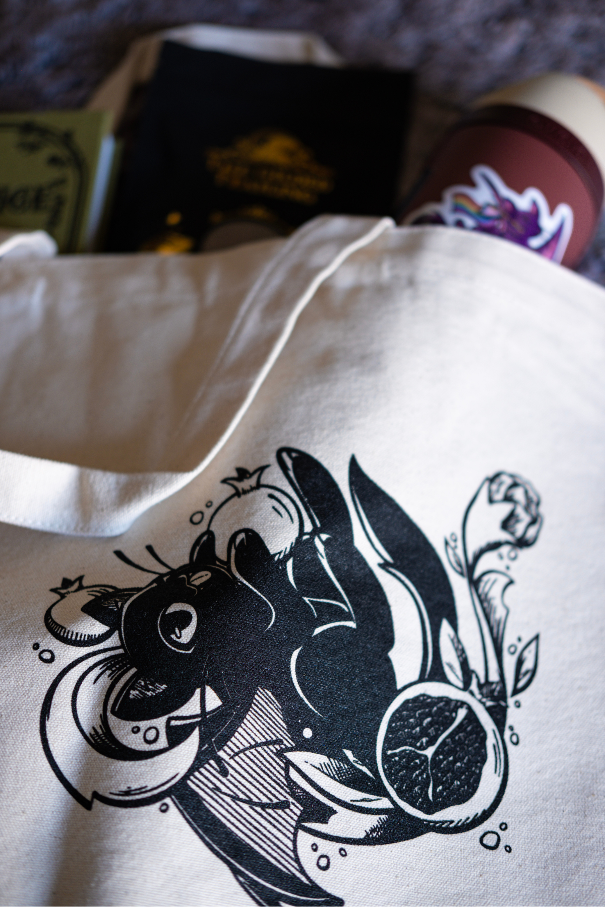 The Teafling’s faithful familiar, Assam, is here to guard your precious loot with our new canvas tote. Assam is our beloved fruit bat cat and is excellent with collecting treasures and trinkets for The Teafling, and they will be a valuable companion for you as well! This adorable feline is here to keep your loot safe.