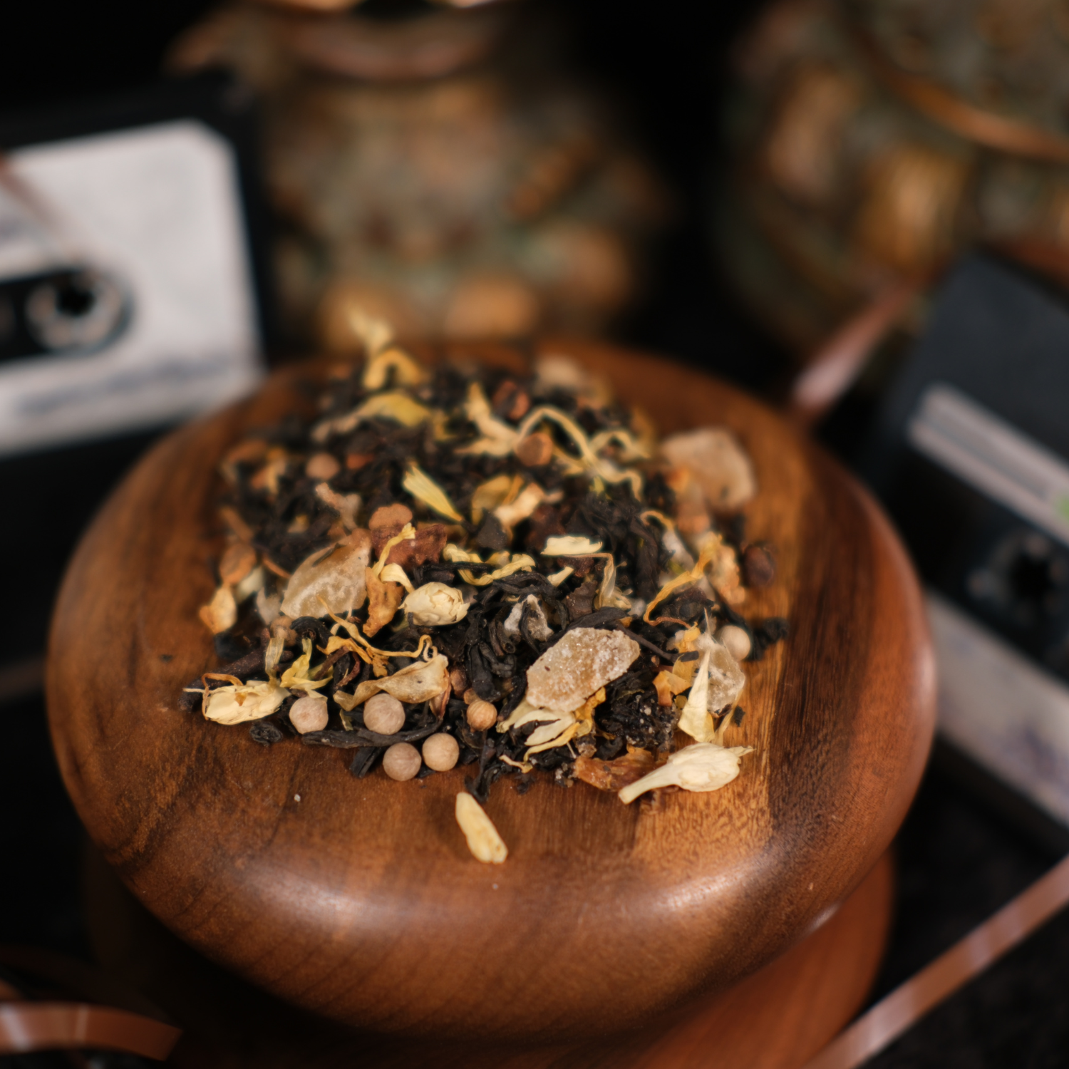 Earl Grey (Black Tea and Bergamot Oil), Candied Ginger, White Pepper, Cinnamon Chips, Dried Orange Peel, Clove, Coriander, Jasmine Flowers, Calendula